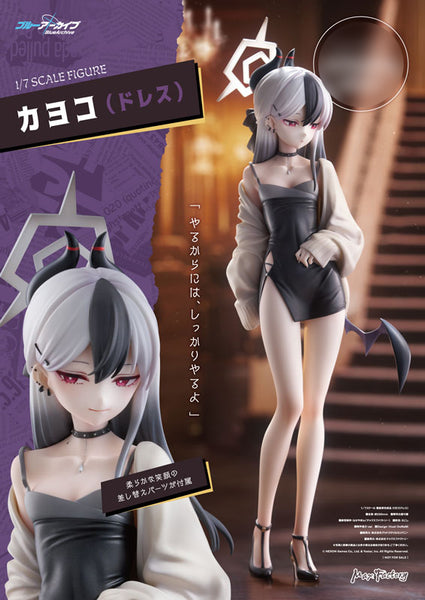 From the popular game "Blue Archive" comes a 1/7 scale figure of Gehenna Academy's member of Problem Solver 68, Kayoko, in the lustrous dress she wore during an undercover mission. The figure retains Kayoko's typically calm and composed aura while showcasing a chic and delicate beauty that perfectly accentuates a special night out. The mature, sophisticated demeanor of the original artwork has been faithfully reproduced in figure form. From Kayoko's characteristic monochrome hair to her supple physique and halo, the meticulously crafted details of this figure are truly a sight to behold. Kayoko's outfit also features a form-fitting black dress that accentuates the body's curves paired with an oversized cardigan draped dramatically over one shoulder. The contrast in material textures is expressed through variations in glossiness and intricate painting, achieving a realism only possible with a figure. Also includes a soft smiling face replacement part. Don’t miss the chance to add this precious snapshot of Kayoko's downtime to your collection!