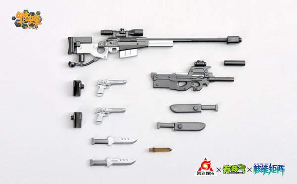 Contents 1xBody, 3xPrinted Faces, 3xBlank Faces Changable Armor Legs and arms x1 set, Changable Legs and arms x1 set “BEE” Backpack x1, Weapons x8, Hands x6 pairs PVC hair x1 set, Base x1, Manual x1, Decal x1, Lens sticker x2 Collarx1