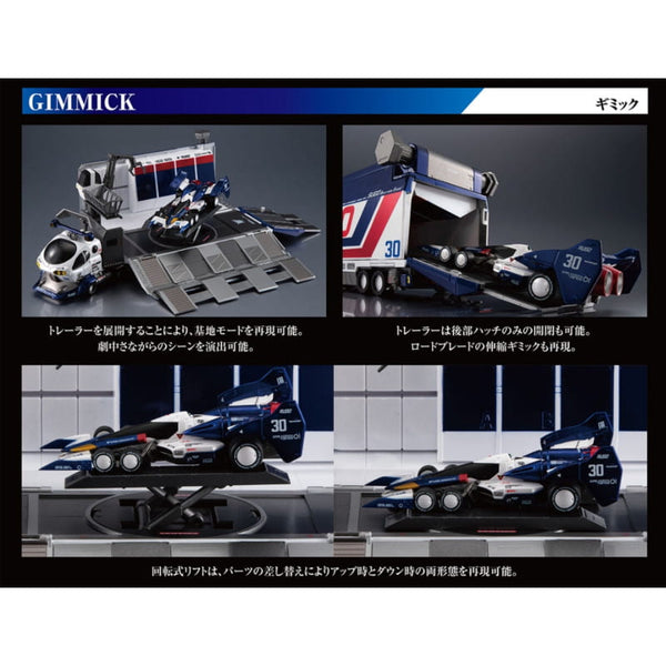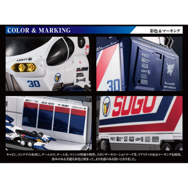 The rear trailer section can be unfolded to transform from trailer mode into base mode. Inside, it features detailed equipment such as a computer room, movable crane, and rotating lift, faithfully recreating the support base seen in the series. Combined with intricate racing-style markings and premium paintwork, this set is a standout addition for Cyber Formula fans.