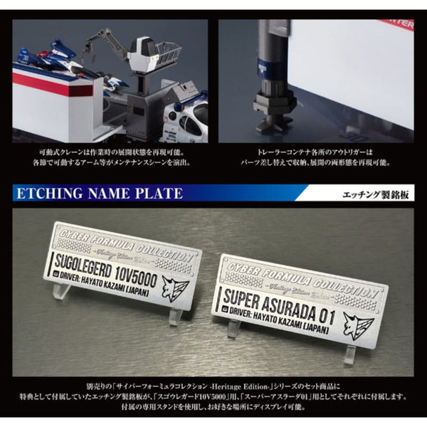 From Future GPX Cyber Formula, this deluxe DX set includes the Sugou Regard 10V5000 transporter, Super Asurada 01 Circuit Mode, Mini Acrylic Stand Set, and a Special etched display plate. The transporter measures approximately 220 mm in length, making it an impressive large-scale display piece.