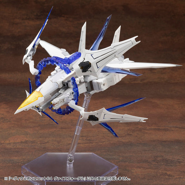 Weiss Vogel: The main wings are movable, and can be switched between forward-swept and backward-swept, or folded. The small drone Humming Beak is included. Humming Beak can also combine with Weiss Vogel. The body is molded in white, the same color used for items such as Orbit Circle and Exenith Wing White Ver., allowing for color-matched customization without the need for painting any pieces. Each section has 3 mm connection points that can be used to attach M.S.G parts, letting users create their own original units. All units use the common 3 mm connection points shared with Frame Arms, HEXA GEAR, and Frame Arms Girl, allowing them to be used as expansion parts. The 3 mm connection points on the underside of the unit are compatible with separately sold flying bases and allow it to be posed in a variety of ways. The barrel on the underside can be either short or long. The shield canopy can be opened and closed. Choose the design of its internal detail between a cockpit seat type or AI type when assembling the model. The boosters built into the main booster can extend together. By rearranging parts, users can assemble Killer Beak, Raging Booster, and Solid Raptor.