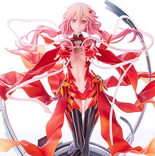 From the popular anime series "Guilty Crown" comes a 1/7 scale figure of the songstress Inori Yuzuriha! The figure is based on the memorable scene of Inori with her arms stretched out holding the Cat's Cradle. Her long, cherry blossom-colored hair flows softly in the breeze, emphasizing her dainty looks. Her soft expression exudes an air of fragility, perfectly balancing the mystique of a songstress with the delicateness of a young girl. Her goldfish outfit features a gradated color scheme going from crimson to orange, highlighting the three-dimensional shadows. The airy frills are sculpted to appear like swaying fins underwater, giving the figure a sense of motion even while still. The base of the figure is inspired by the Void Effect from the series, and the silver frame and parts intertwine to create an impressive display reminiscent of the final scene of the series. Be sure to add this special figure to your collection!