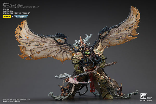 Premium quality figure of Mortarion, Daemon Primarch of Nurgle, from the Warhammer 40,000 series by JOYTOY. This detailed collectible features iconic weapons 'The Lantern' and 'Silence', showcasing exceptional craftsmanship and vibrant paintwork.